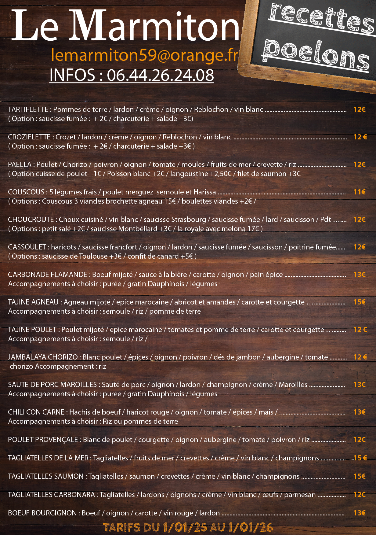 forfait CUISINIER sur place : 75€ / Forfait gaz 20€ / Etuve obligatoire 50€